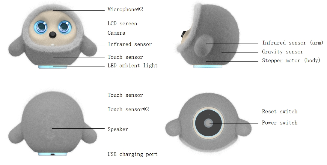 | Layar Ekspresi LCD | 4.28 inci LCD (mata), ndhukung tampilan ekspresi dinamis lan tampilan binokular (kayata Umpan balik visual nalika "main mati" utawa "tumindak cute"). |