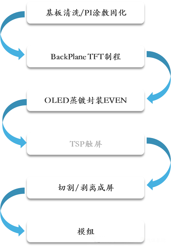 Proses manufaktur inti AMOLED kalebu sawetara proses unit teknis banget. Ing proses TFT TFT (BP), teknologi polticrystalline suhu rendah (LTPS) wis dadi ide utama amarga mobilitas elektron sing dhuwur. Proses struktur gapura-gate kalebu langkah kayata deposisi lempung buffer, implantasi saluran saluran saluran, pelindung laser anneinte (ELA), gunakake logam sputtering, lan implantasi saluran banyu. Gas khusus sampeyan duwe peran kritis ing deposisi film tipis, modifikasi, lan etching: Contone, proses PECVD nggunakake film Sih₄ / N₂o / Nho / SIOX tips; Deposisi 40 atom (ALD) nggunakake TMA lan H₂O kanggo mbentuk lapisan enkapsulation; Etching garing entuk pertandingan tliti kanthi dhuwur liwat gas kayata CF4 / SF6 / CL2, ing ngendi BCL3, lan CL2 ngasilake produk etis logam, lan mriksa proses sing resik lan efisien.