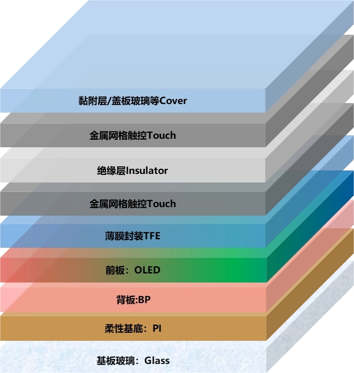 Struktur inti kasebut kalebu lapisan emitting cahya oled, backplane TFT, elektrods logam, lanctrat, lan Casing.