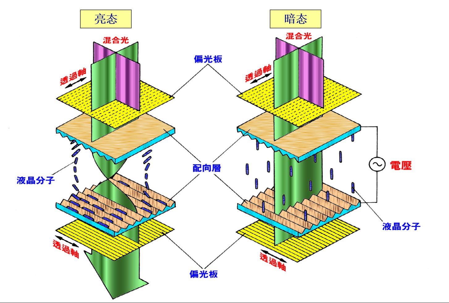 Ing negara peteng (negara tampilan), molekul kristal Cairan ing wilayah sing ditrapake listrik sing ditrapake ngganti jajaran lan ilang kemampuan sing entheng. Cahya polarzy sing dipunctir saka polarzer ngarep ora bisa ngganti arah lan diblokir amarga arah polarisasi dadi jejeg maneh ing polarizer mburi, nyebabake warna kasebut katon ireng.
